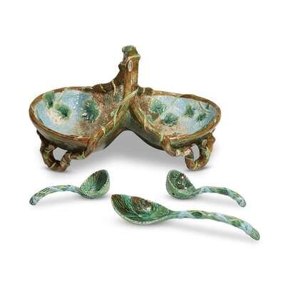 The surface decorated with modeled strawberry plants and flowers, the underside with signature tortoise-shell glaze; marked "GJ" to underside and accompanied by three serving spoons. (4).