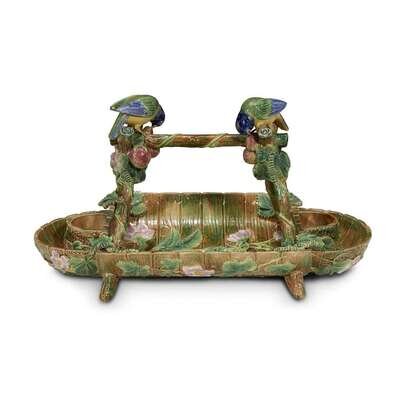 The body in the form of a barrel-like trough, with two smaller barrels attached to a faux bois trellis, on which two birds perch and feast on strawberries; the entire surface decorated with strawberry branches, flowers, and fruit.