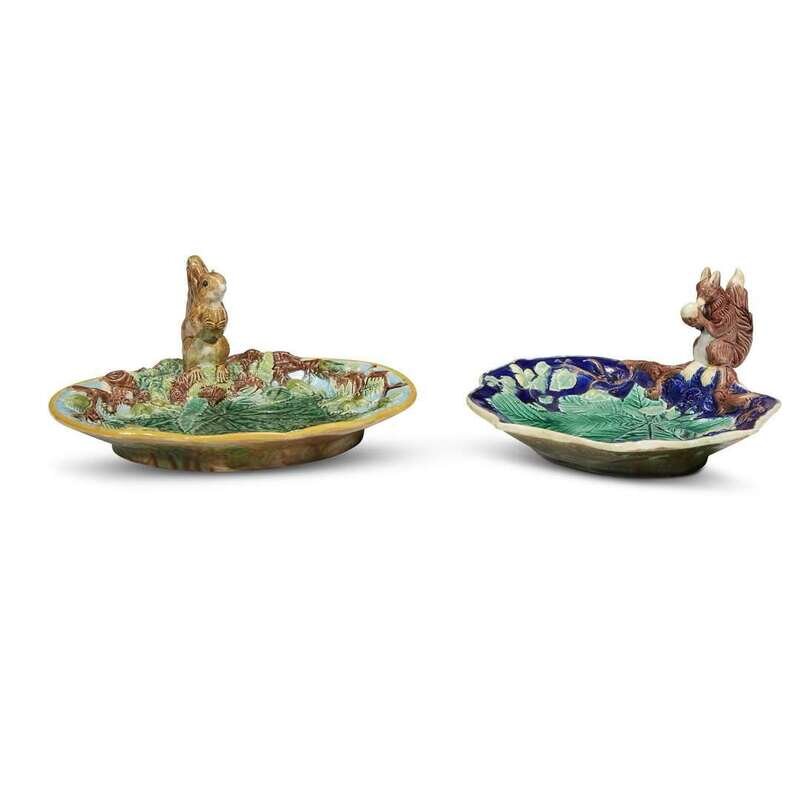 Two English majolica nut dishes with modeled squirrels late 19th century