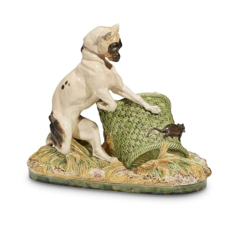 Animated with a modeled dog chasing a mouse against a fallen basket; signed Trodoux, unmarked to underside.