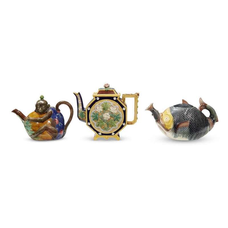 Comprising a Minton majolica teapot in the form of a monkey holding a coconut, marked with impressed "Mintons" mark and transfer-printed label, circa 1865; a teapot in the form of a fish swallowing another fish, unmarked but attributed to Royal Worcester, circa 1880; and a Staffordshire teapot of octagonal shape with modeled floral motifs, unmarked, circa 1870. (3).