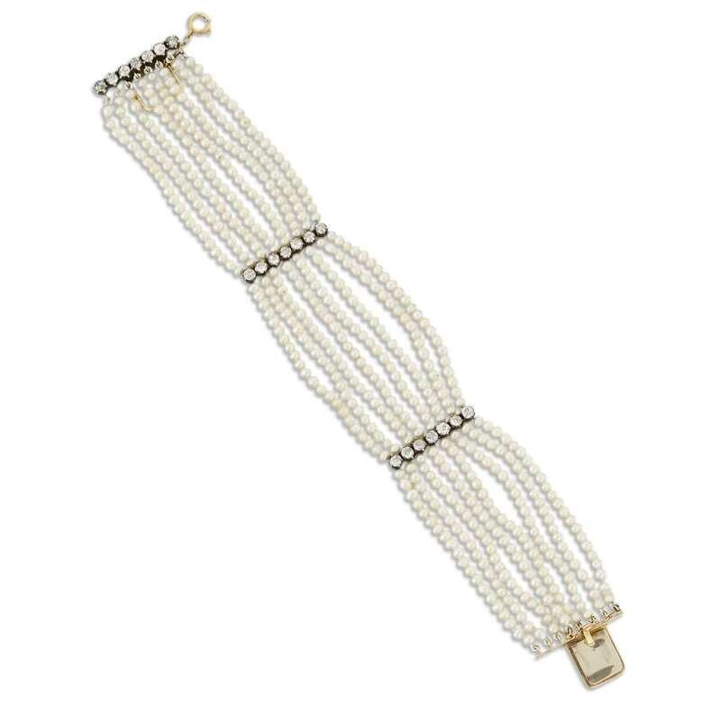 designed as eight rows of pearls, (not tested for natural) accented by old mine-cut diamond bar spacers set in silver; estimated total diamond weight 2.00 carats, completed by an eighteen karat yellow gold clasp.