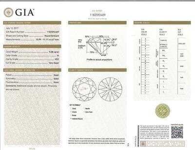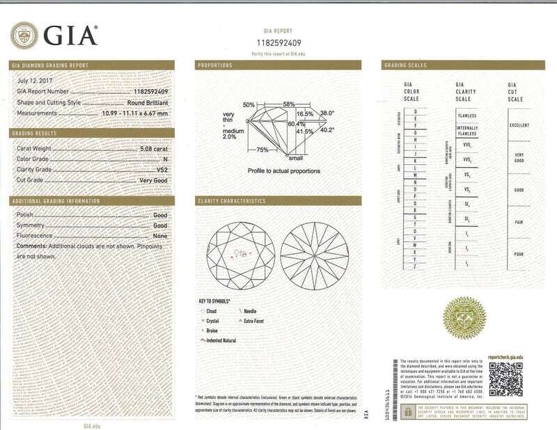 a prong-set round brilliant-cut diamond, weighing 5.08 carats.