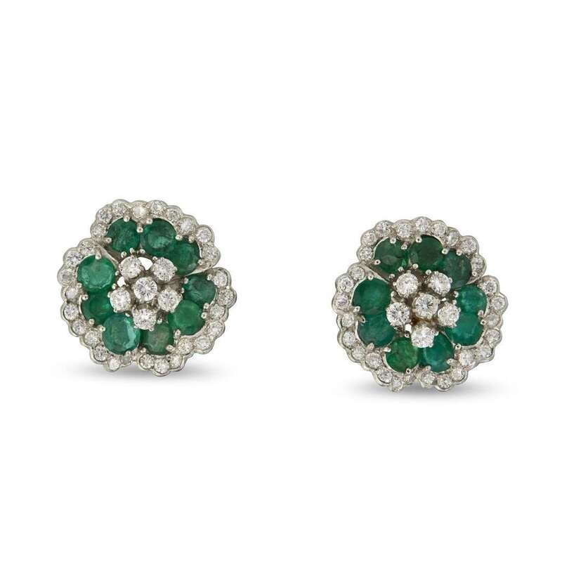 designed as undulating flowerheads with circular-cut emeralds; estimated total weight 5.00 carats, diamond center and edge; estimated total diamond weight 5.00 carats, mounted in platinum.