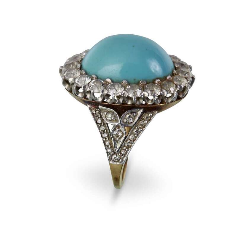 centering an oval cabochon-cut turquoise, measuring approximately 14.43 x 11.53 x 6.25mm, surrounded by circular-cut diamonds and diamond accented shoulders; estimated total diamond weight: 1.25 carats.