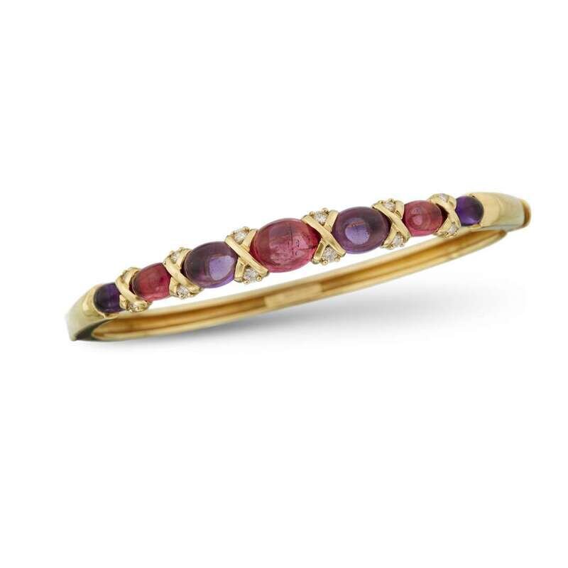 alternating oval cabochon pink tourmaline and amethysts separated by round brilliant-cut diamonds.
