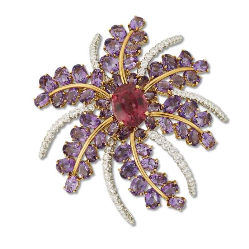 floral motif centering an oval pink tourmaline, measuring approximately 14.5 x 11.5mm, accented by numerous oval amethysts and round brilliant-cut diamonds; estimated total diamond weight: 2.15 carats.