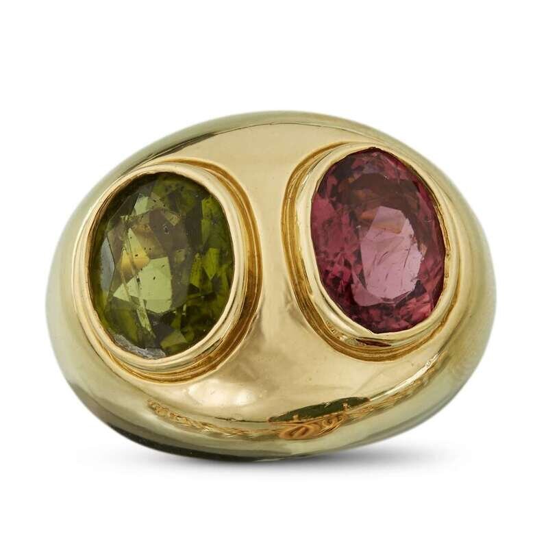set with a green and a pink tourmaline, measuring approximately 13 x 10mm each.