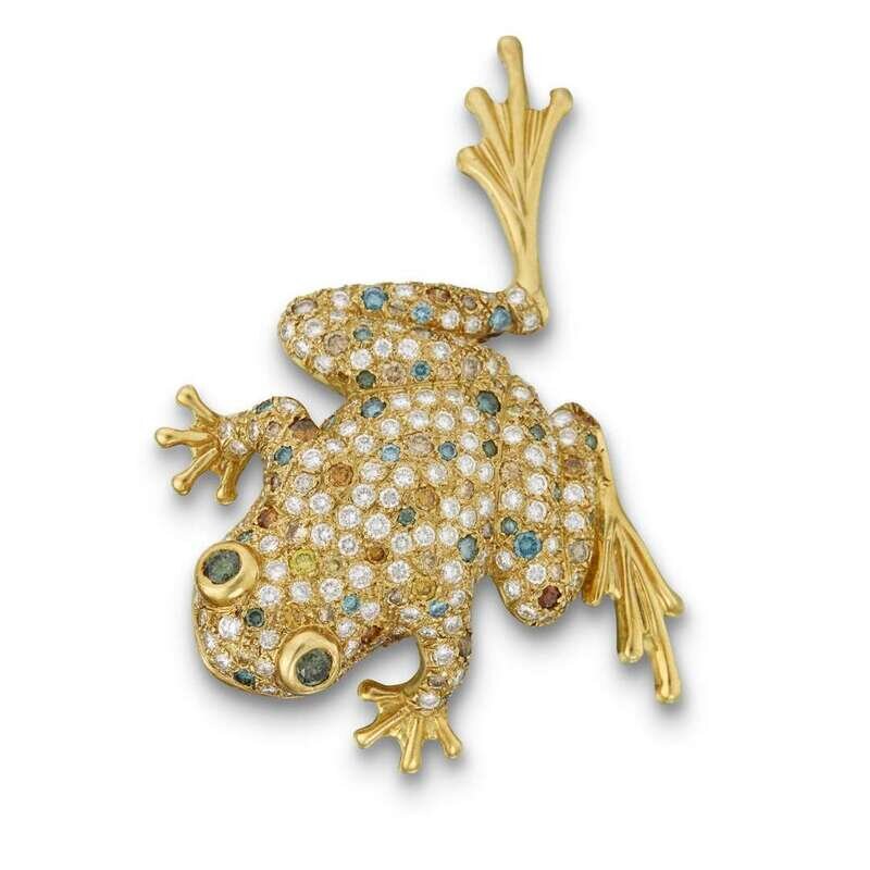 designed as a frog, with pavé-set diamond and colored diamond body (diamonds not tested for origin of color) with green gem-set eyes; estimated total diamond weight: 2.70 carats.