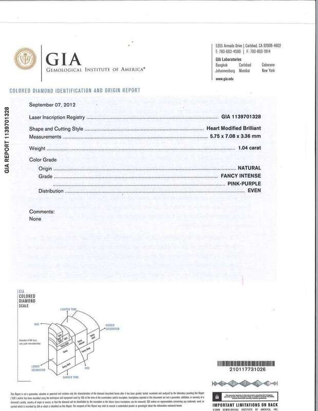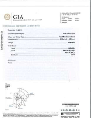 a heart shape, fancy intense pink-purple diamond weighing 1.04 carats.