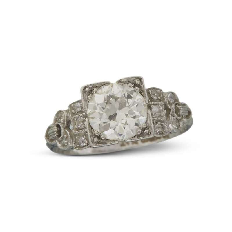 centering an old European-cut diamond, weighing approximately 1.40 carats, accented by old single-cut diamonds.