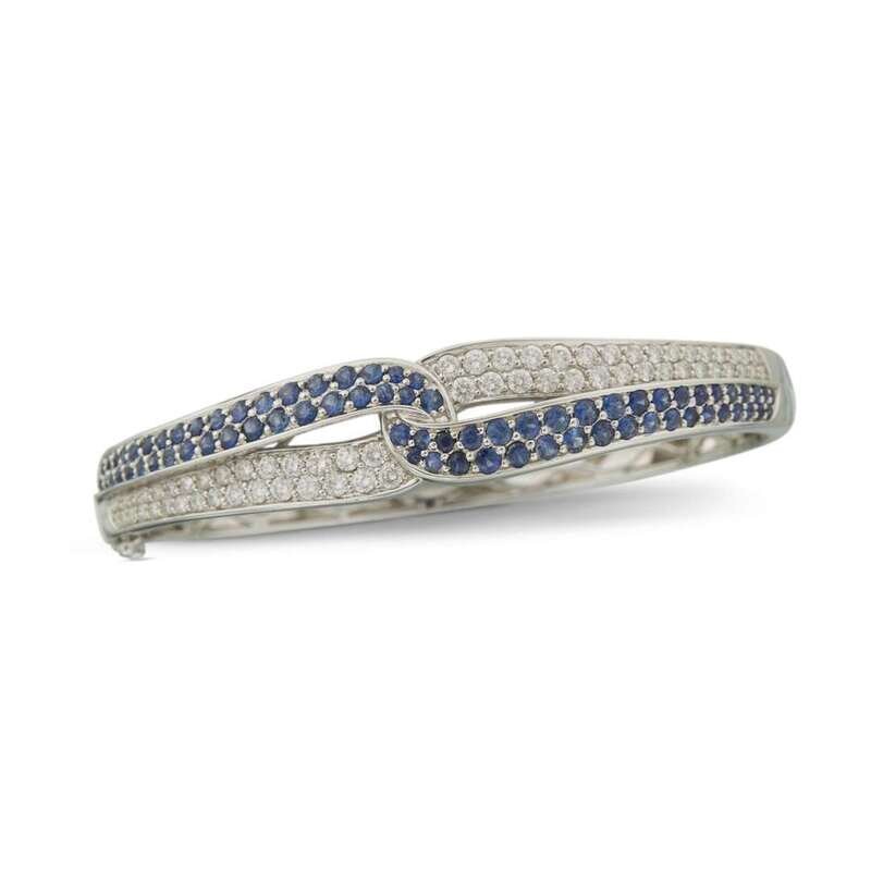designed as intertwining loops set with circular-cut diamonds and sapphires; of hinged design; estimated total diamond weight: 1.20 carats.