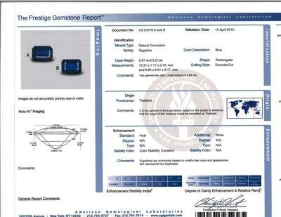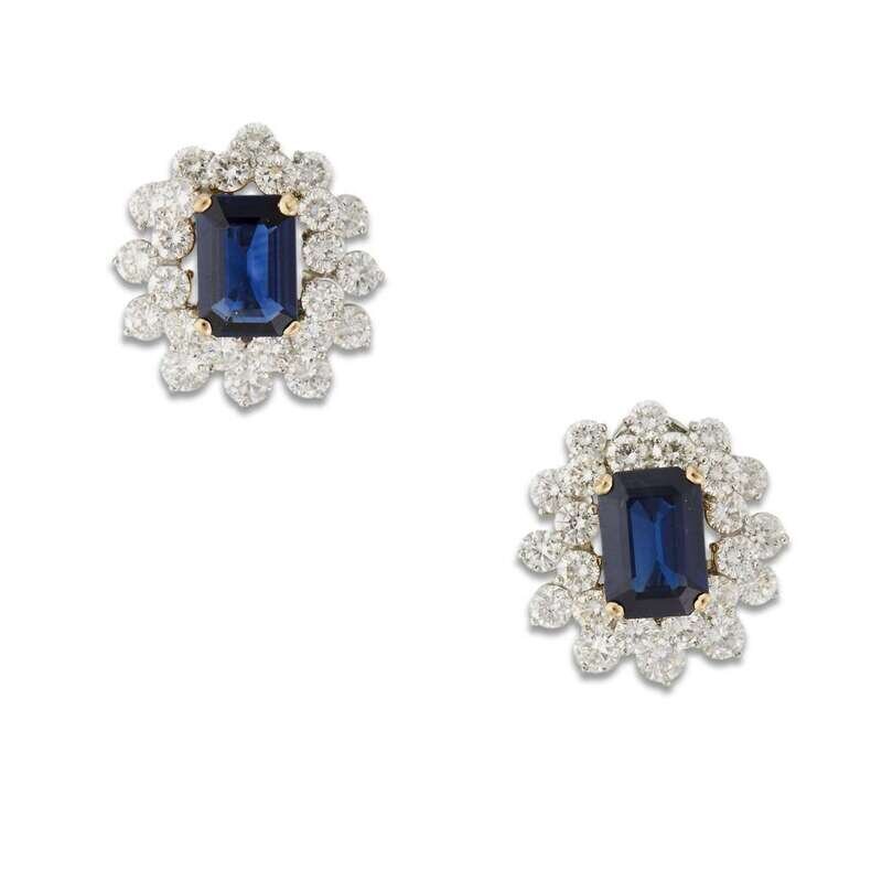 each centering an emerald-cut sapphire; weighing approximately 2.20 and 2.15 carats, accented by round brilliant-cut diamonds; estimated total diamond weight: 5.00 carats.