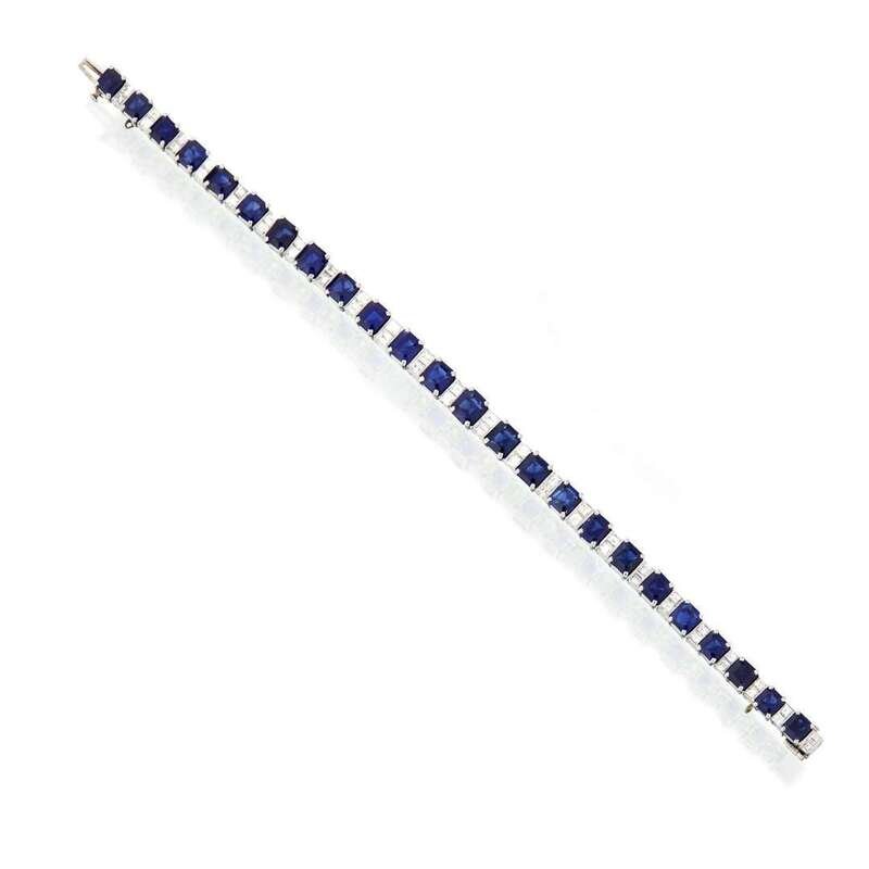 A diamond, sapphire and platinum line bracelet
