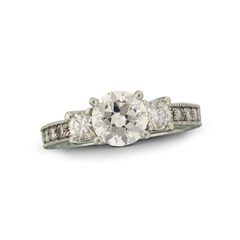 centering a round brilliant-cut diamond, weighing approximately 1.30 carats, flanked by round brilliant-cut diamonds, weighing approximately 0.20 carat each; set in a detailed platinum mounting with circular-cut diamond shoulders.