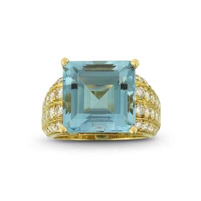 centering a square emerald-cut aquamarine, weighing approximately 9.40 carats, accented by round brilliant-cut diamonds; estimated total diamond weight: 1.30 carats.