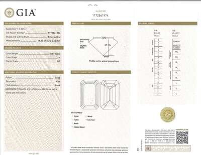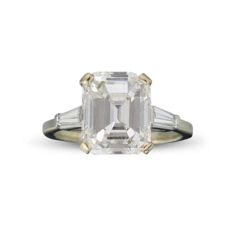 centering an emerald-cut diamond, weighing 5.57 carats, flanked by tapering baguette-cut diamonds, mounted in fourteen karat white gold.