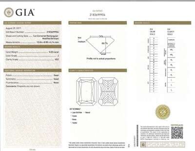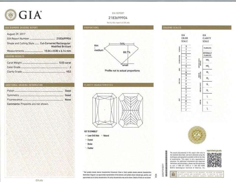 a cut-cornered rectangular modified brilliant-cut diamond, weighing 5.03 carats.