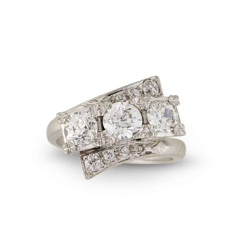 set with three old European-cut diamonds, weighing approximately 0.40, 0.45 and 0.65 carat each, accented by old European and single-cut diamonds.