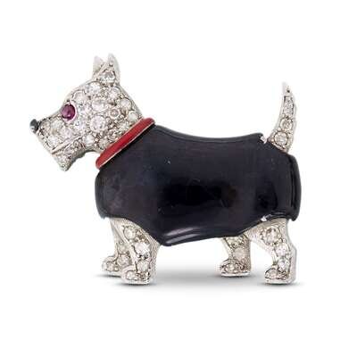 designed as a Scottie dog with circular-cut pavé-set diamond head, legs and tail, accented by red enamel collar and ruby eye, mounted in platinum.
