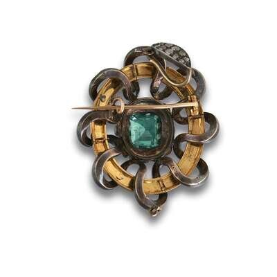 ribbon motif brooch centering an emerald-cut emerald, weighing approximately 2.25 carats, accented by rose-cut diamonds, pin stem with French assay marks.
