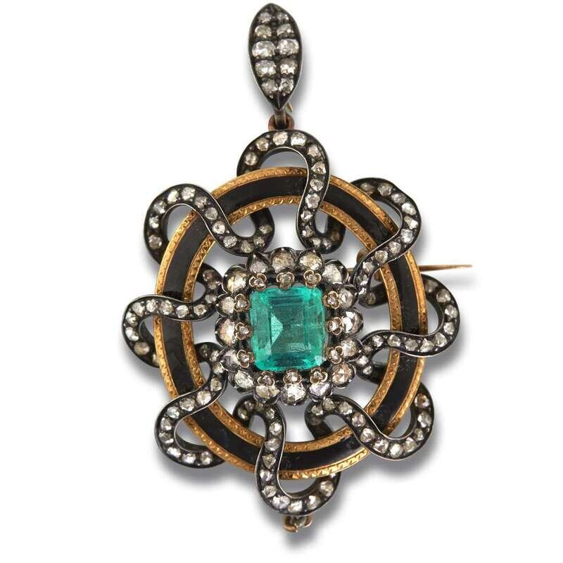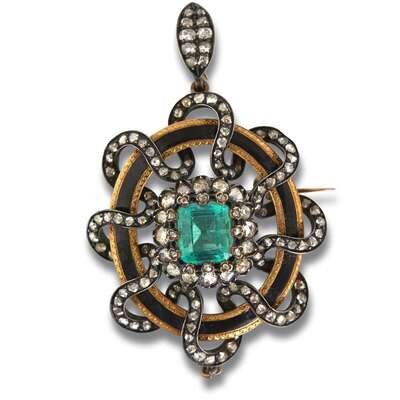 An antique emerald, diamond, enamel, silver and eighteen karat gold pendant-brooch, Bailey Banks & Biddle circa 1880