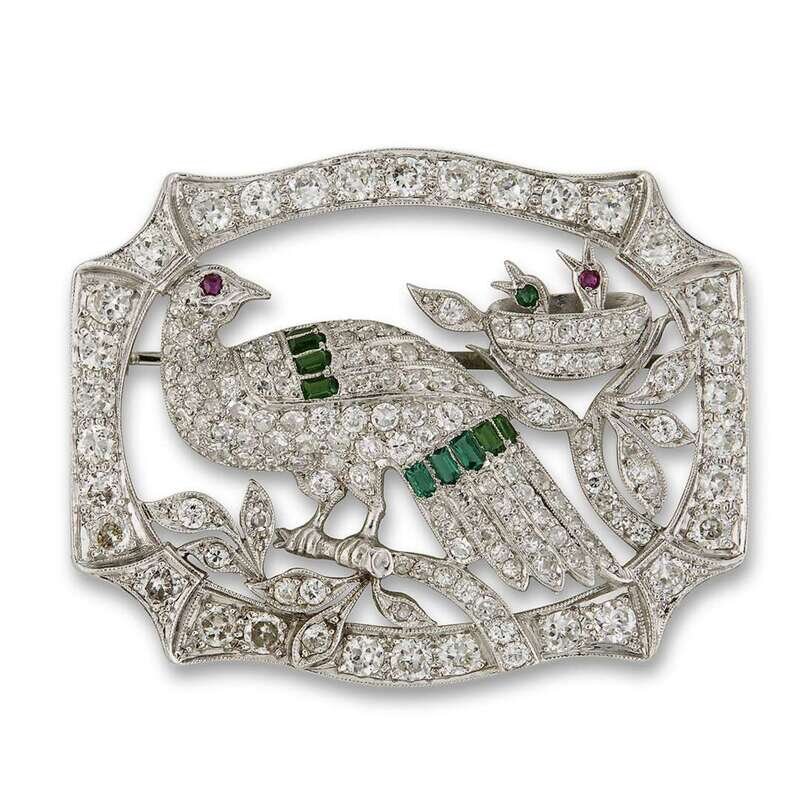A diamond, gemstone and platinum peacock brooch