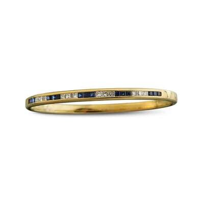 channel-set to the top with princess-cut diamonds and calibré-cut sapphires; of hinged design.
