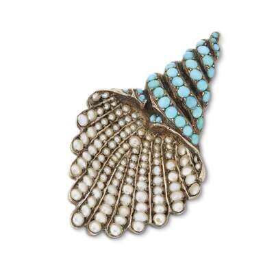 designed as an open shell motif, set with split pearls and turquoise in eighteen karat gold, with French assay marks.