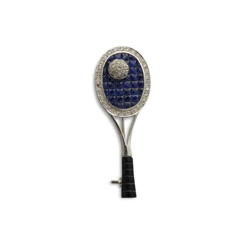 A sapphire, diamond, black onyx and eighteen karat gold tennis racquet brooch
