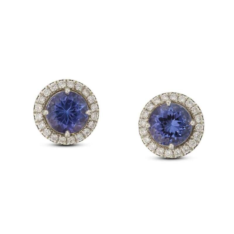 each centering a round tanzanite surrounded by round brilliant-cut diamonds; estimated total tanzanite weight: 1.40 carats.