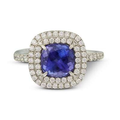 centering a cushion-cut tanzanite, weighing approximately 2.00 carats, surrounded by a double row of round brilliant-cut diamonds.