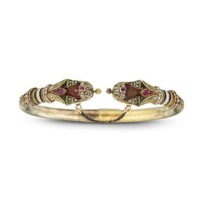 hinged design set with addorsed carved agate pharoah heads with ruby, green, white and black enamel headdress, accented by rose-cut diamonds, wire twist and bead work, in eighteen karat and fourteen karat gold.