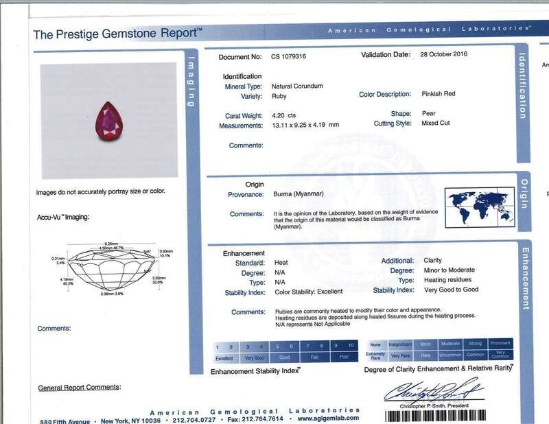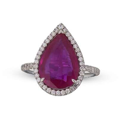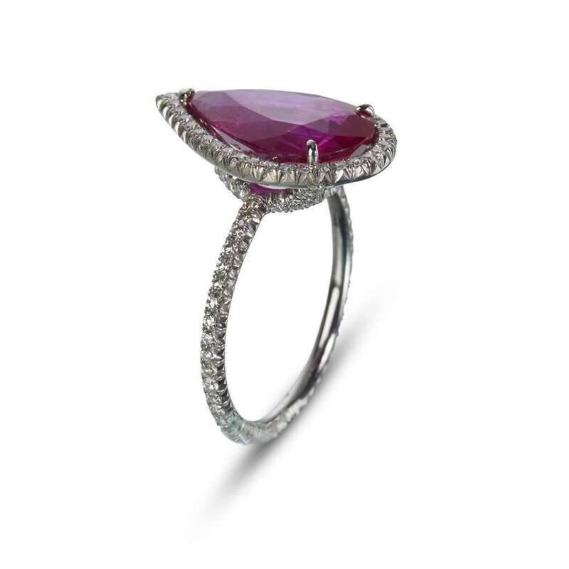 set with a pear-shaped ruby, weighing 4.20 carats, surrounded by a micro pavé-set diamond gallery and shank, mounted in a platinum Taffin setting.