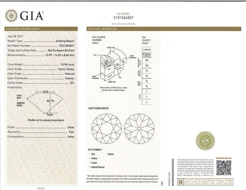an old European-cut fancy yellow diamond, weighing 10.98 carats.