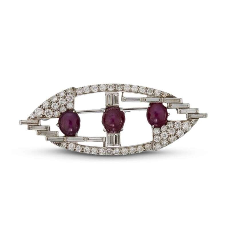 An Art Deco diamond, ruby and platinum brooch, Bailey Banks & Biddle circa 1925