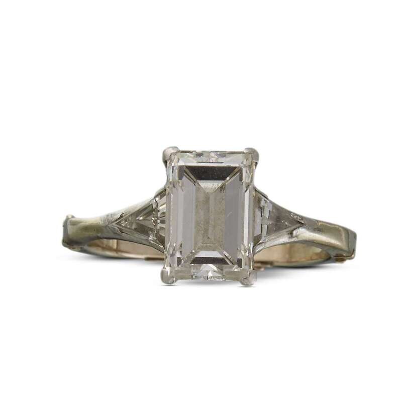 centering an emerald-cut diamond, weighing approximately 2.15 carats, flanked by triangular-cut diamonds; mounted in eighteen karat white gold with a fourteen karat white gold expandable shank.