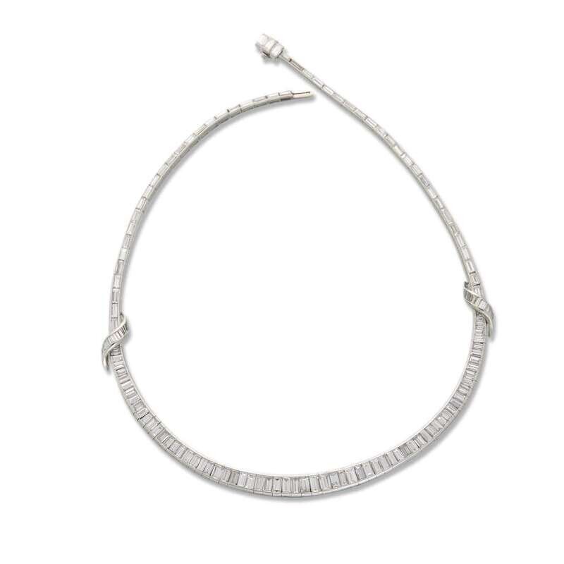 designed as a semi-flexible tapering row of straight baguettes; estimated total diamond weight: 25.00 carats, accented by diamond ties and clasp.