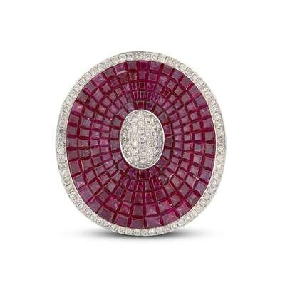 the undulated top with pierced under gallery invisibly set with square calibré-cut rubies; estimated total ruby weight: 15.00 carats, accented by round brilliant-cut diamonds; estimated total diamond weight: 1.20 carats.