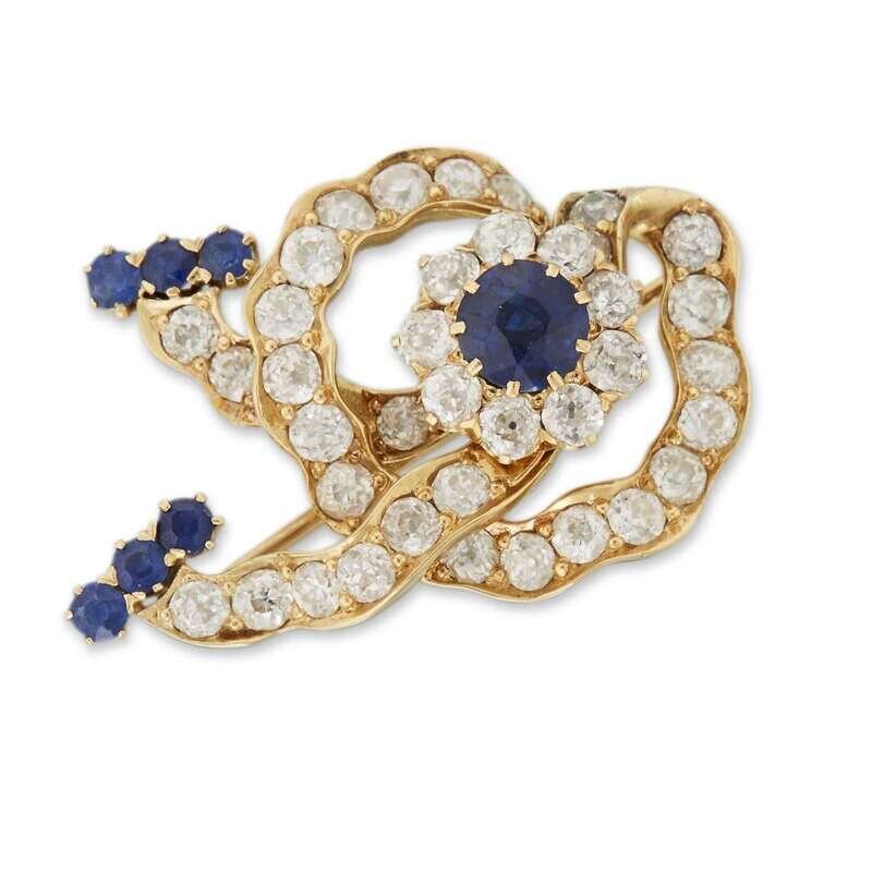 designed as a flower, centered by a circular-cut sapphire, weighing approximately 0.85 carats, surrounded by circular-cut diamonds, further set with circular-cut diamonds in a ribbon motif; estimated total diamond weight: 1.95 carats.
