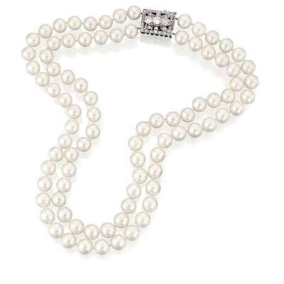 composed of two strands of cultured pearls, measuring approximately 8.70 to 9.50mm, completed by a circular-cut diamond clasp; estimated total diamond weight: 1.55 carats.