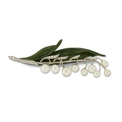 the green enamel leaf suspending a sprig of pearl 'lillies of the valley' accented by circular-cut diamonds set in platinum, signed Marcus.