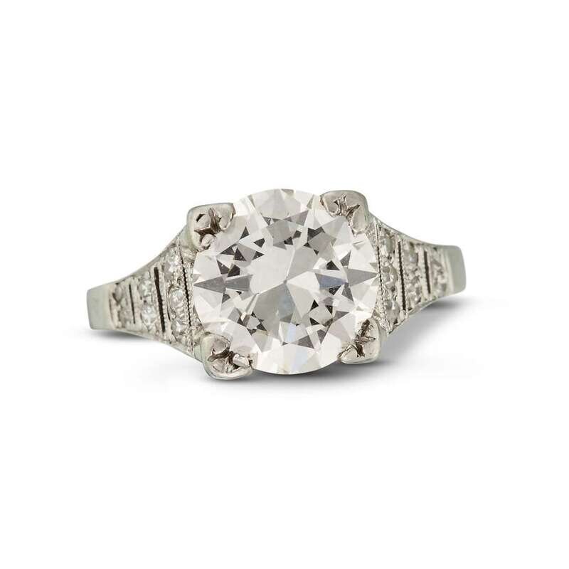 set with an old European-cut diamond, weighing approximately 2.20 carats, set within a tiered circular-cut diamond platinum mount.