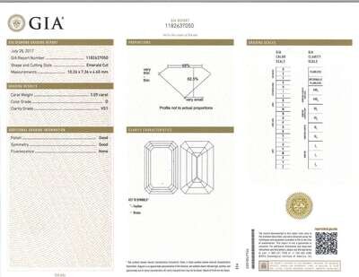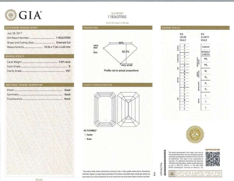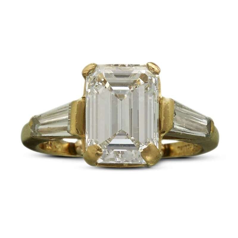 centering an emerald-cut diamond, weighing 3.09 carats, flanked by tapering baguettes; estimated total remaining diamond weight: 0.66 carat; mounted in eighteen karat gold.
