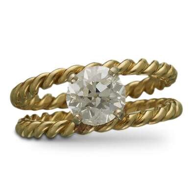 centering an old European-cut diamond, weighing approximately 1.45 carats, mounted in a twisted eighteen karat gold setting.