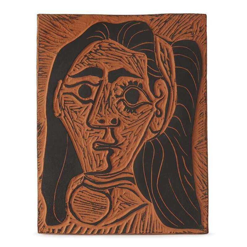 1964, numbered 33/100, with the 'EMPREINTE ORIGINALE DE PICASSO' and 'MADOURA PLEIN FEU' stamps on the underside. Red earthenware clay plaque.