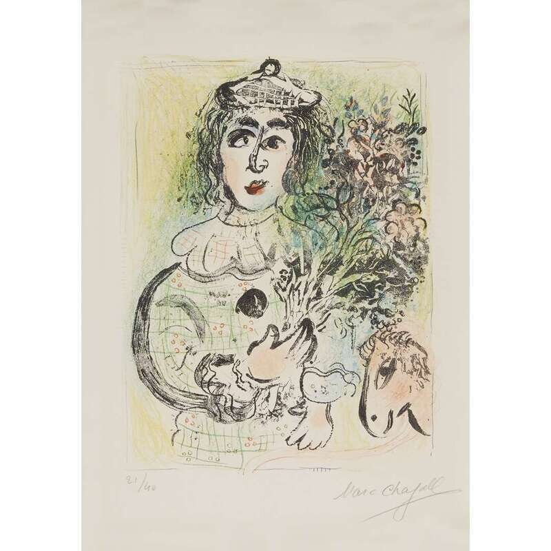 MARC CHAGALL (FRENCH/RUSSIAN, 1887-1985) "THE CLOWN WITH FLOWERS"FROM VOLUME II OF "THE LITHOGRAPHS OF CHAGALL"