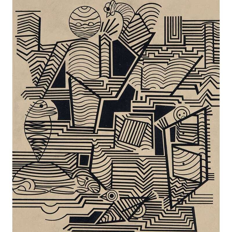 Signed bottom right, signed again, titled and dated 1939 verso, acrylic on paperboard.