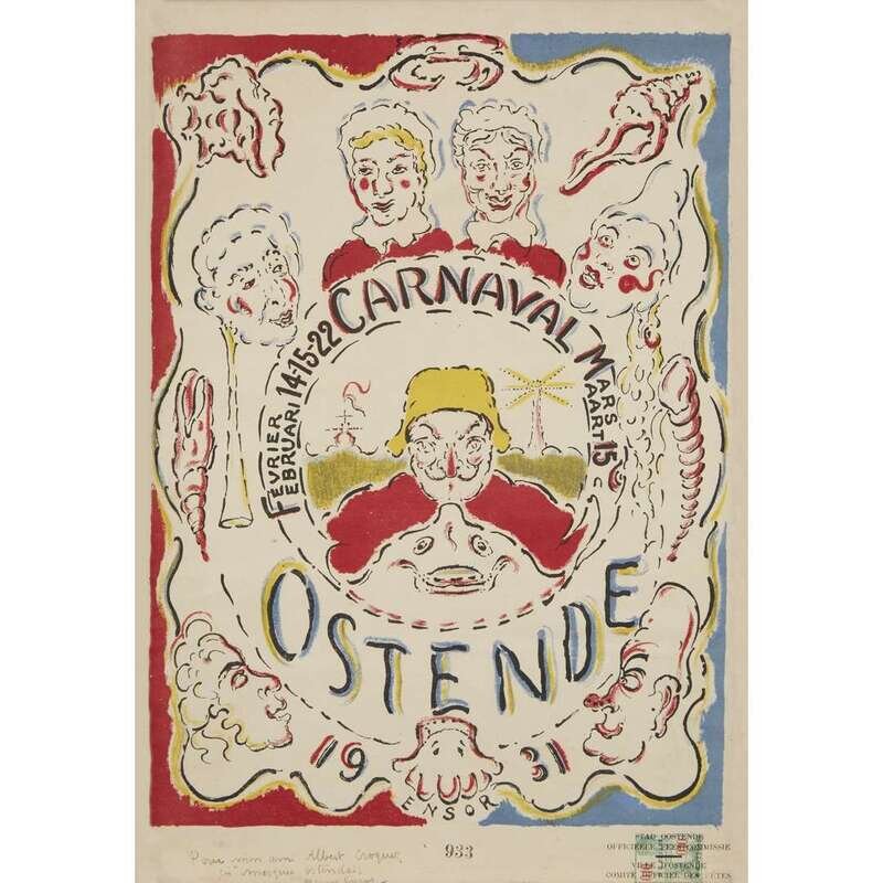 1931, signed and dedicated 'Pour mon ami Albert Croquez/ces masques Ostendais' in black ink, stamp numbered 933, with the official City of Ostende Carnival Committee stamp, with margins. Color lithographic poster on thin wove paper.