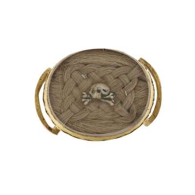 Of oval form, with enameled skull and crossbones set against hairwork ground and under faceted rock crystal, the reverse with loop attachments and engraved initials, "MH," seemingly unmarked.
